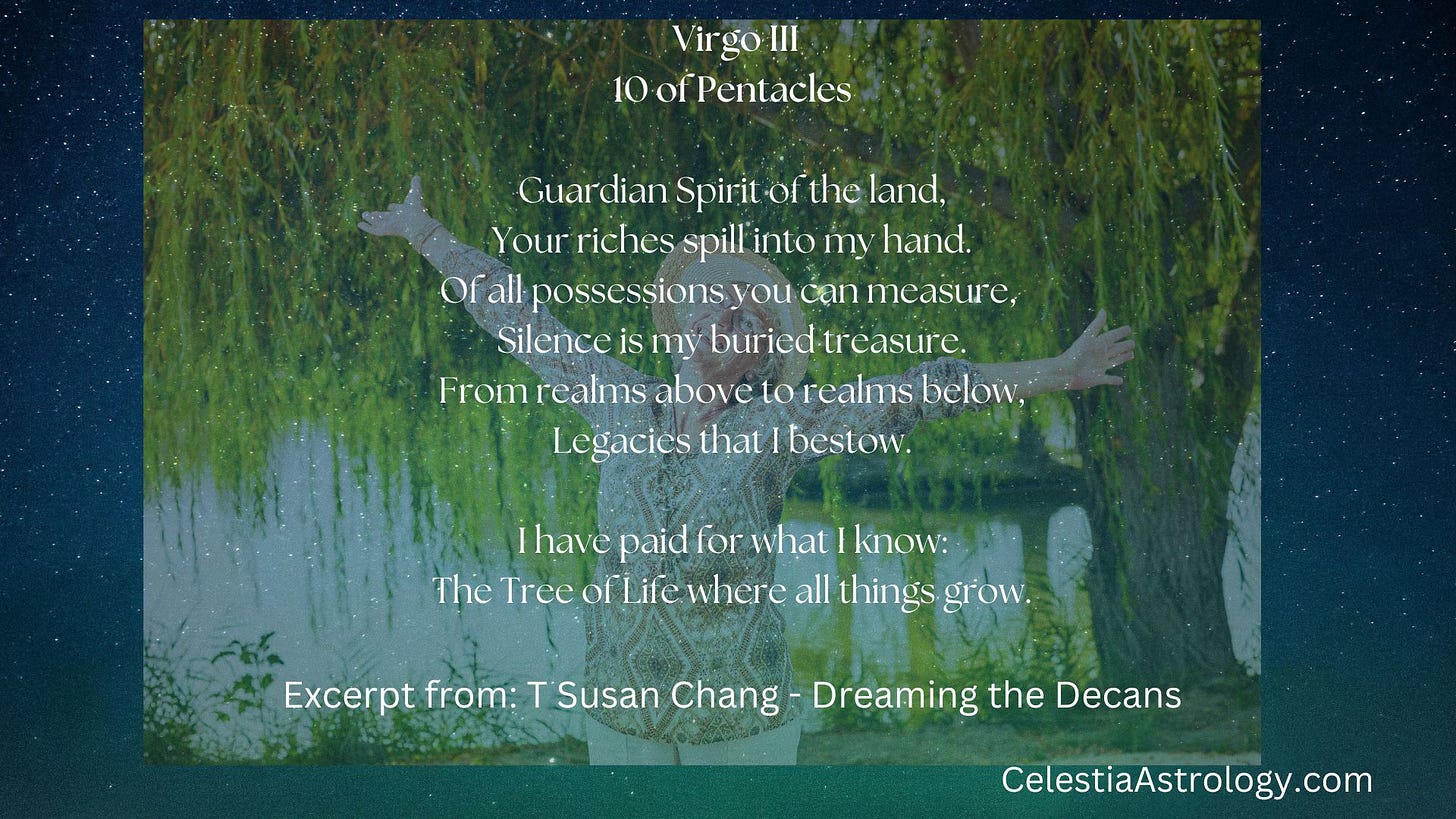 The Guardian Spirit reflects the Virgoan reverence for tradition and stewardship, while "riches spill into my hand" acknowledges both the material and spiritual wealth inherited from those before us. The line "Silence is my buried treasure" aligns with Virgo’s introspective, wisdom-seeking nature, valuing understanding over extravagance.