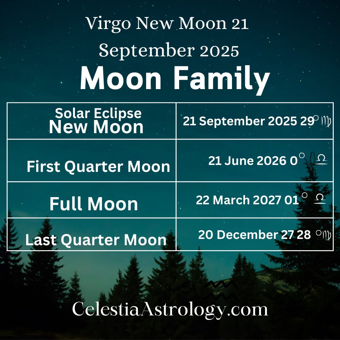 This two-year lunar family cycle is beginning with the New Moon at 29° Virgo on September 21, 2025 will be supercharged with Eclipse solar power. The story initiated then unfolds in phases until the Last Quarter Moon on December 20th, 2027. Each phase builds upon the last, revealing key developments in a longer story.